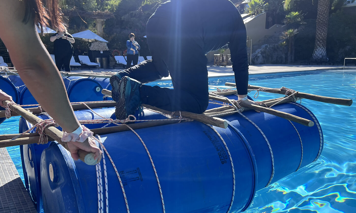 Los equipos diseñan y construyen una balsa para trasladar al equipo de un punto a otro, promoviendo consenso, planificación y ejecución.